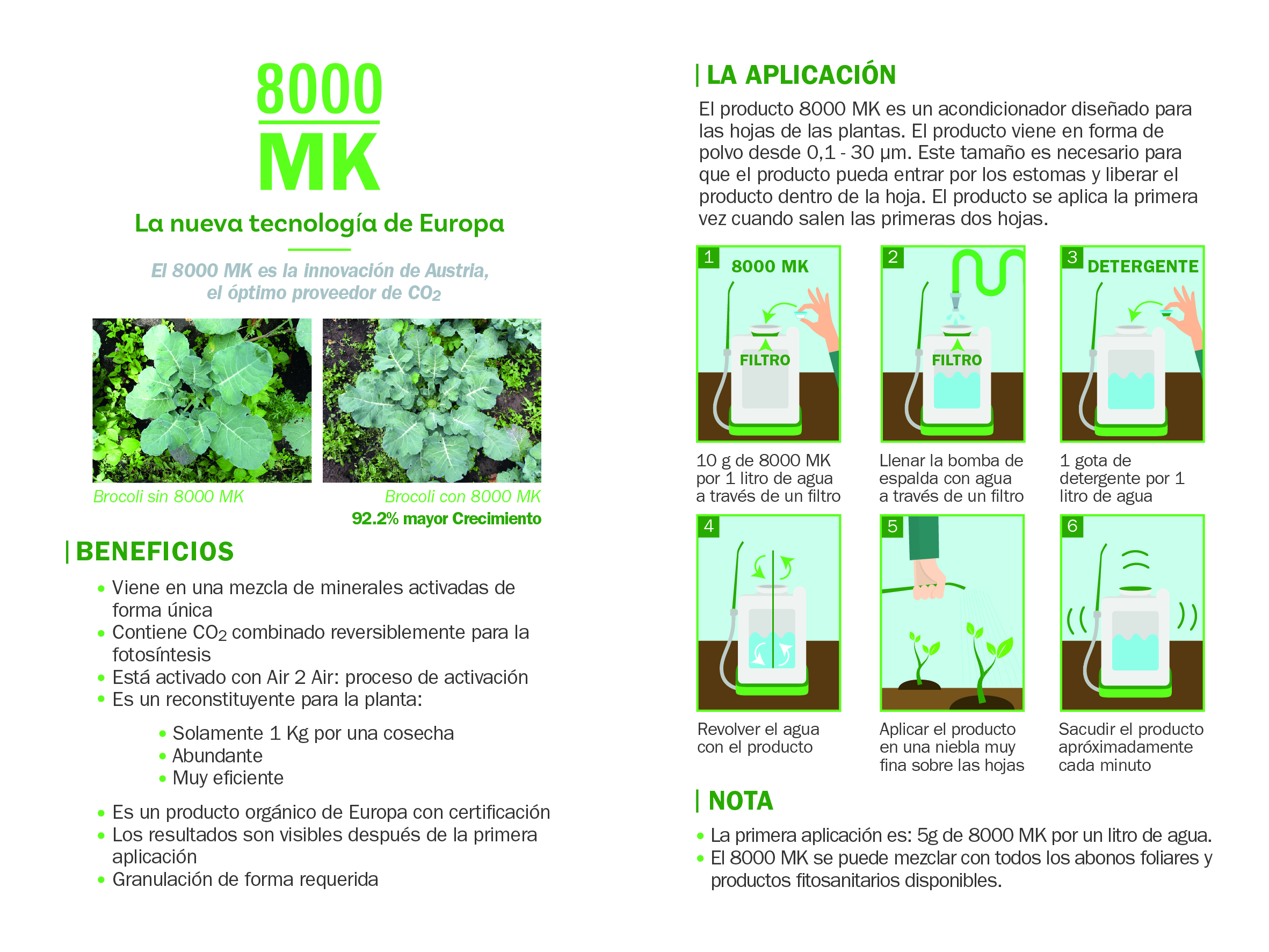 8000 MK es un acondicionador para la superficie de las hojas, diseñado especialmente para ayudar a la planta con la cantidad óptima de CO2, el cual ha sido comprobado como el factor clave que limita el crecimiento de las plantas. El producto entra por los estomas de las hojas y empieza a desglosarse, dando como resultado la liberación de CO2.